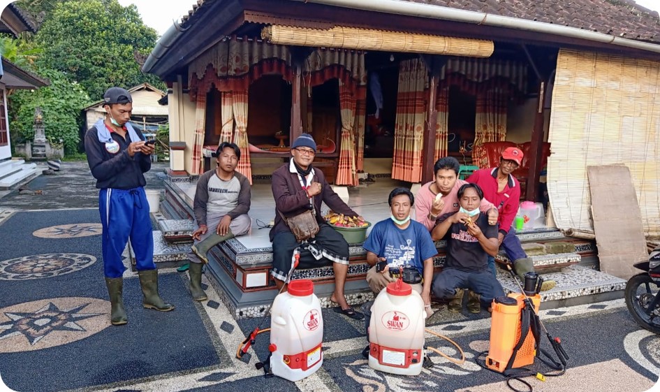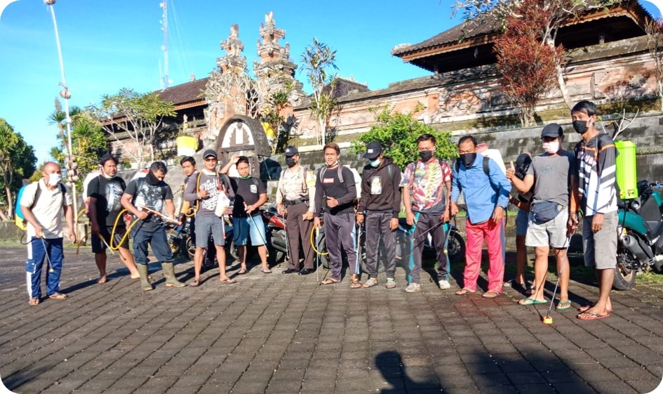 Perbekel desa Jatiluwih memimpin Satgas Covid-19 desa Jatiluwih yang meliputi segenap aparatur desa, didukung oleh Desa Adat se-Desa Jatiluwih, unsur Pemuda, Babinsa, Babinkamtibmas, Manajemen DTW Desa Jatiluwih dan Relawan untuk bergotong royong melakukan kegiatan penyemrotan disinfektan. kegiatan penyemprotan disinfektan dilakukan pada tempat-tempat umum dan obyek wisata termasuk ke rumah-rumah warga masyarakat.