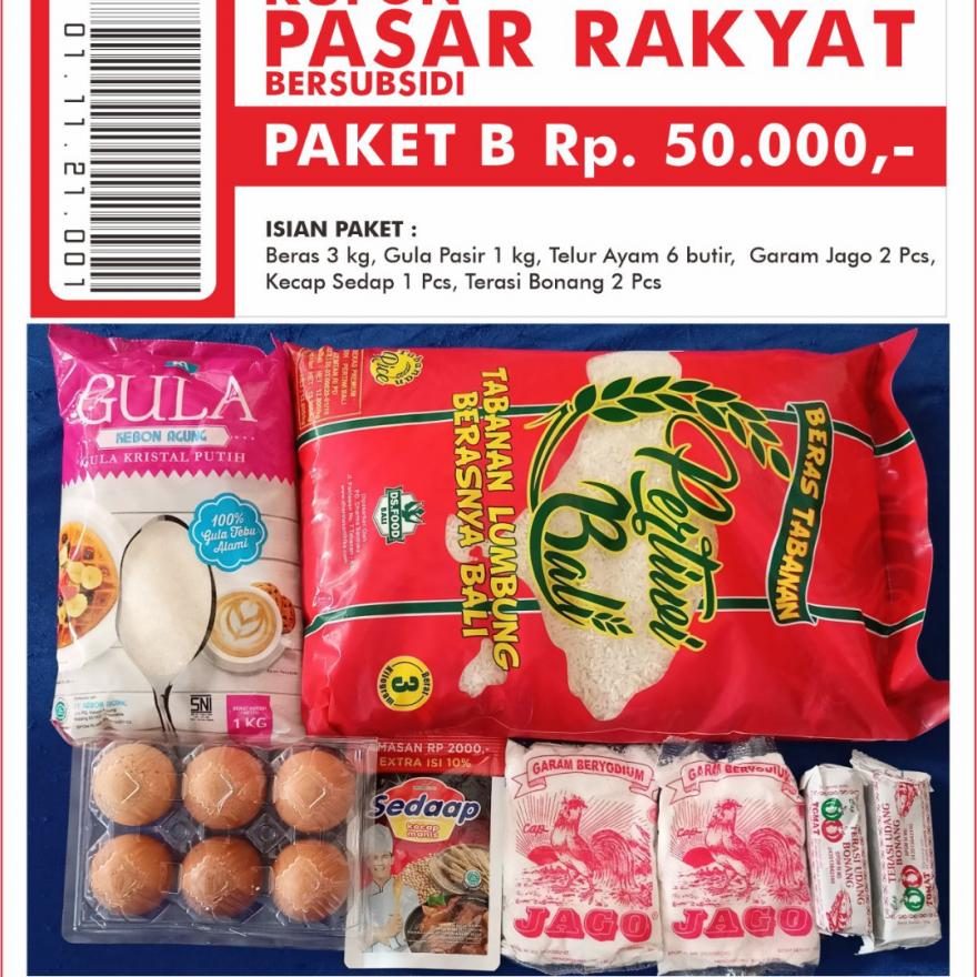 Paket B terdiri dari : Beras putih 3 kg,gula pasir 1 kg,telur ayam 6 butir,garam jago 2 pcs,kecap sedap 1 pcs,terasi bonang 2 pcs.