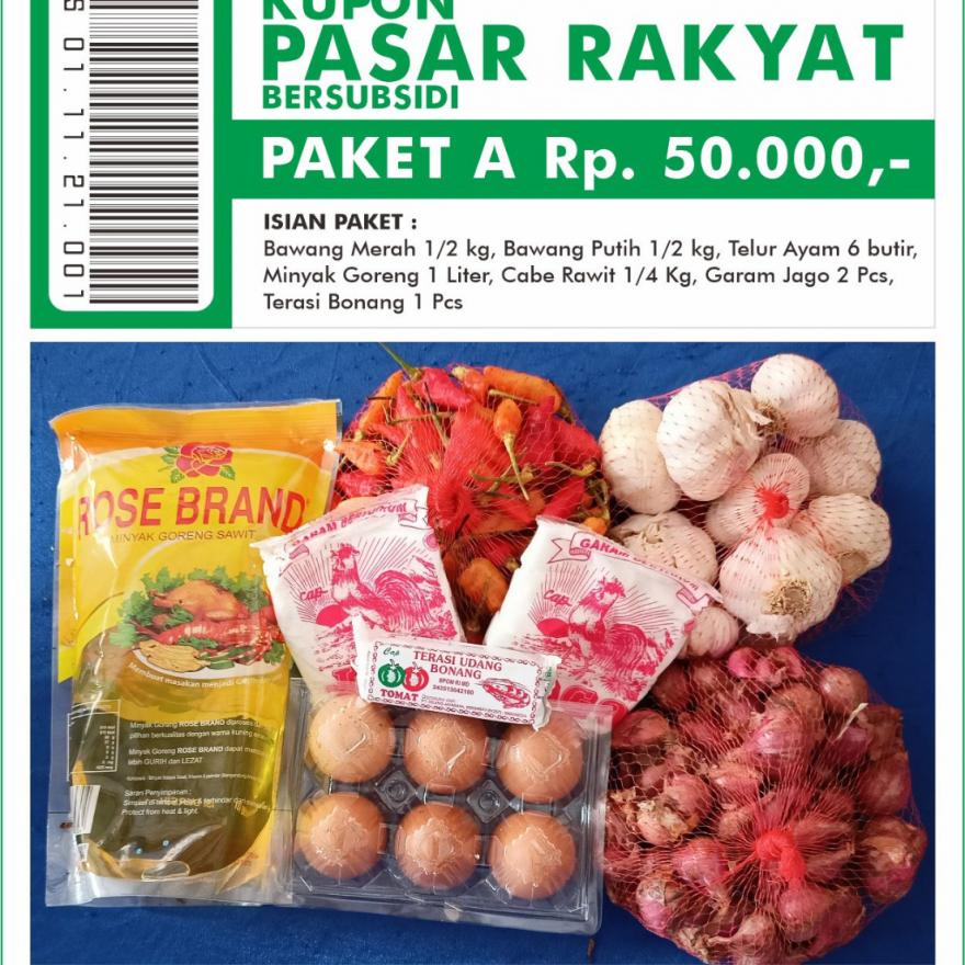 Paket A terdiri dari : Bawang merah 1/2 kg,bawang putih 1/2 kg,telur ayam 6 butir,minyak goreng 1 liter,cabe rawit 1/4 kg,garam jago 2 pcs,terasi bonang 1 pcs.