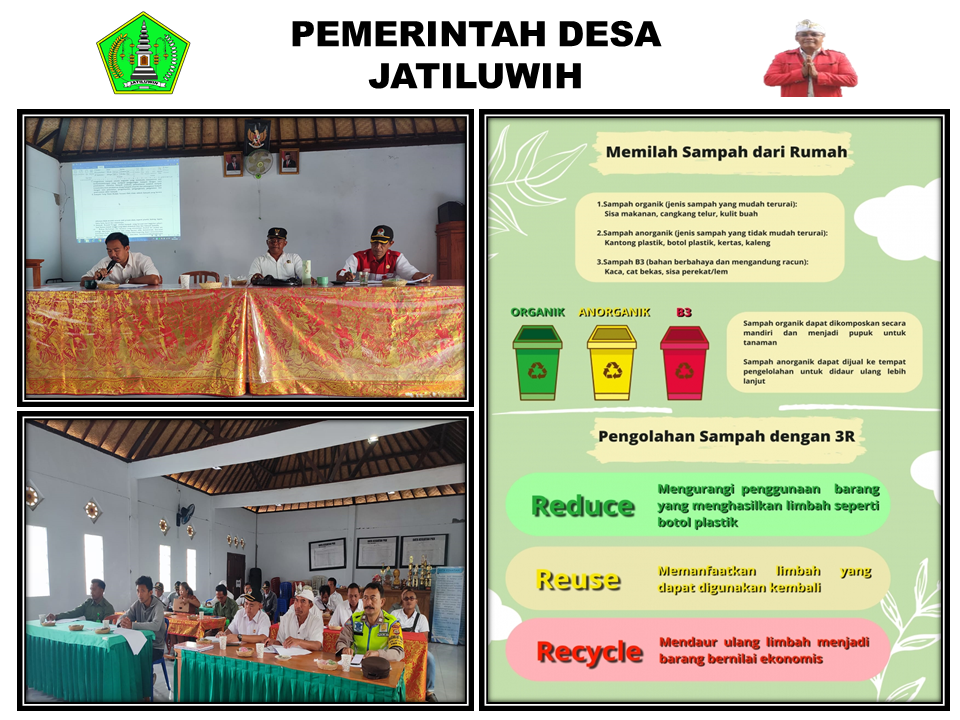 Bertempat di aula Kantor Desa, Pemerintah Desa Jatiluwih Kecamatan Penebel,Kabupaten Tabanan menggelar Rapat Pembahasan Draf Perdes terkait Pengelolaan Sampah Berbasis Sumber.Rapat dihadiri oleh Perbekel Desa Jatiluwih,Perangkat Desa dan Staf Desa,Ketua BPD beserta Anggota,Ketua LPM beserta Anggota,Bendesa Adat Jatiluwih dan Gunungsari,Manajer Oprasional DTW Jatiluwih beserta Divisi yang menangani sampah,Ketua Bumdes Asta Merta Sedana,Ketua TP.PKK Desa Jatiluwih,Bhabinkamtibnas dan Babinsa Desa Jatiluwih.