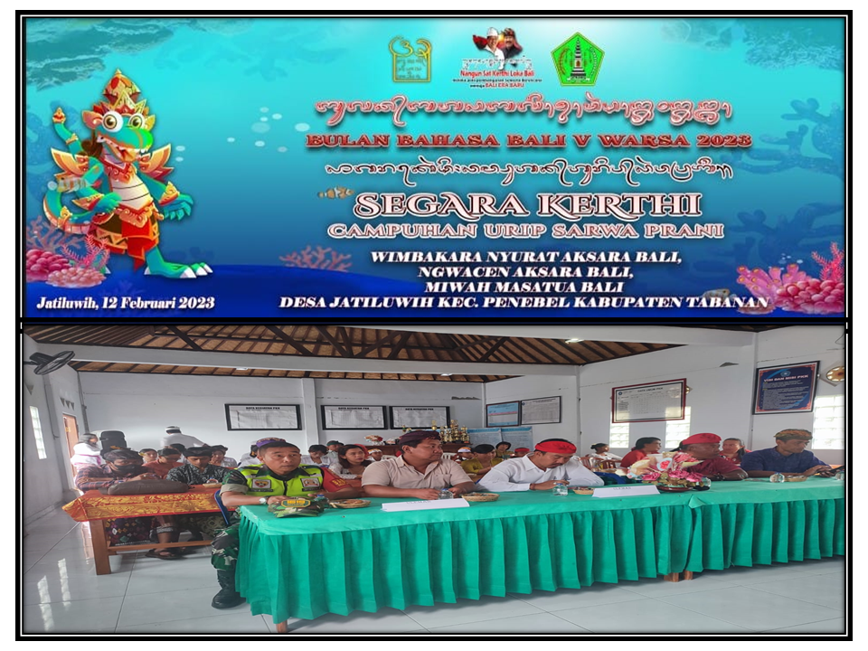 Jatiluwih,12 Pebruari 2023,Dalam rangka Pelestarikan dan pengembangan bahasa,aksara dan sastra Bali Pemerintah Desa Jatiluwih menggelar Bulan Bahasa Bali yang bertempat di aula Kantor Desa Jatiluwih.Pelaksaan Bulan Bahasa Bali ke V tahun 2023 mengusung tema 'Segara Kerthi: Campuhan Urip Sarwa Prani' yang dimaknai sebagai altar pemuliaan Bahasa, Aksara, dan Sastra Bali untuk memaknai laut sebagai awal dan akhir kehidupan segenap makhluk.